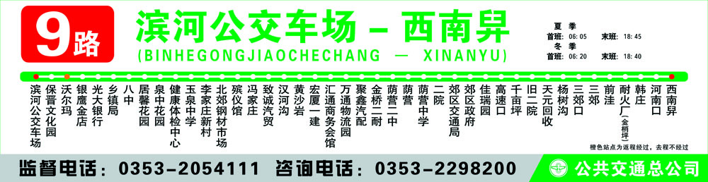 濱河公交車場 - 保晉文化園 - 銀鷹金店 – 光大銀行 - 鄉(xiāng)鎮(zhèn)局 - 八中 - 居馨花園 – 泉 中花園 - 健康體檢中心 - 玉泉中學 - 李家莊新村 - 北郊鋼材市場 – 殯儀館 - 馮家莊 – 致誠汽貿(mào) - 漢河溝 - 黃沙巖 - 匯通商務會館 - 萬通物流園 - 聚鑫汽配 - 金橋二耐 - 蔭營二中 - 蔭營 - 蔭營中學 - 二院 - 郊區(qū)交通運輸局 - 郊區(qū)政府 - 佳瑞園 - 高速口 - 千畝坪 - 舊二院 - 天元回 收 - 楊樹溝 - 三郊口 - 新世紀 - 三郊 - 前洼 - 耐火廠(金梢坪)- 韓莊 - 河南口 - 西南 舁 - 五里莊 - 雨下溝