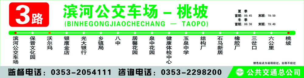 濱河公交車場 - 保晉文化園 - 銀鷹金店–光大銀行 - 鄉(xiāng)鎮(zhèn)局 - 八中 - 居馨花園 - 泉中花園 - 健康體檢中心 - 玉泉中學(xué) - 結(jié)構(gòu)廠 - 石馬新居 - 橡膠廠 - 三 岔口 - 六公里 - 桃坡
