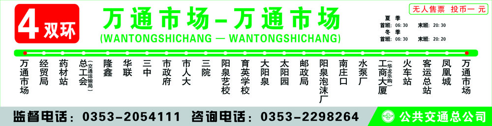 萬通市場 - 經(jīng)貿(mào)局–藥材站 - 總工會(交通運輸局)- 隆鑫 - 華聯(lián) - 三中 - 市政府 - 市人大 - 三院 - 陽泉藝校 - 育英學校 - 大陽泉 - 郵政局(太陽園) - 陽泉 泡沫廠 - 南莊口 - 水泵廠 - 工商大廈(華龍樂購) - 火車站 - 客運總站 - 鳳凰城 - 萬通市場